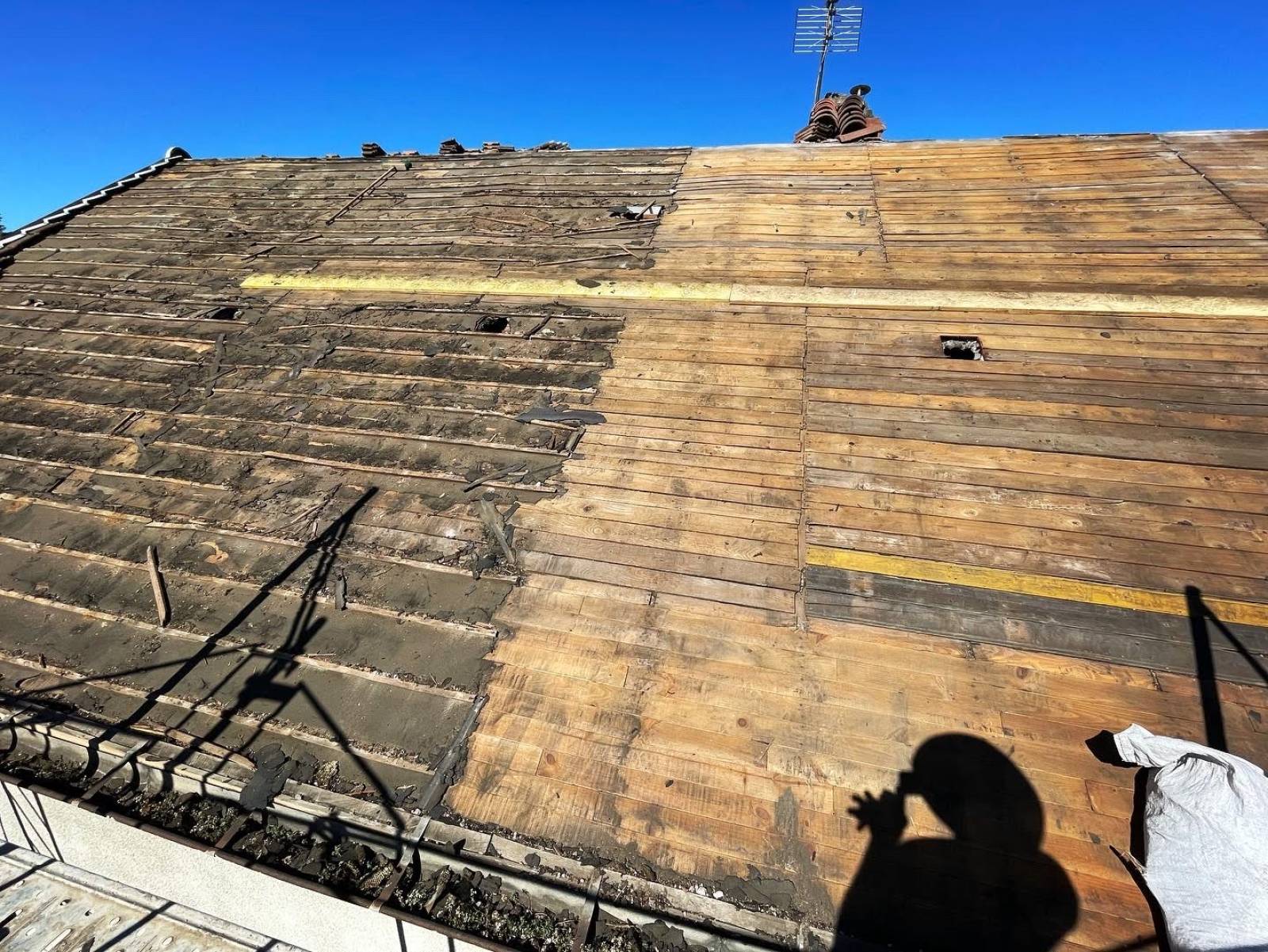 Dépose des anciens liteaux et nettoyage approfondi de la volige afin d’assurer une base saine pour la nouvelle couverture.